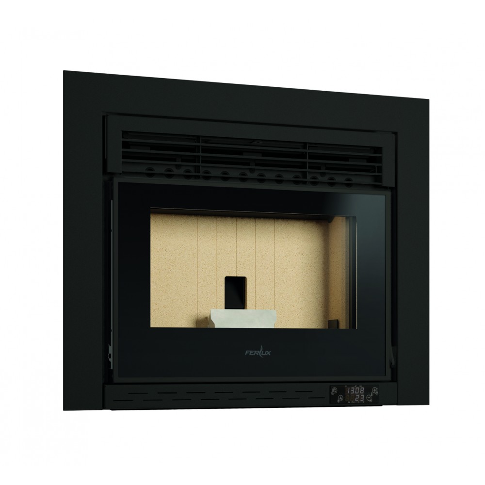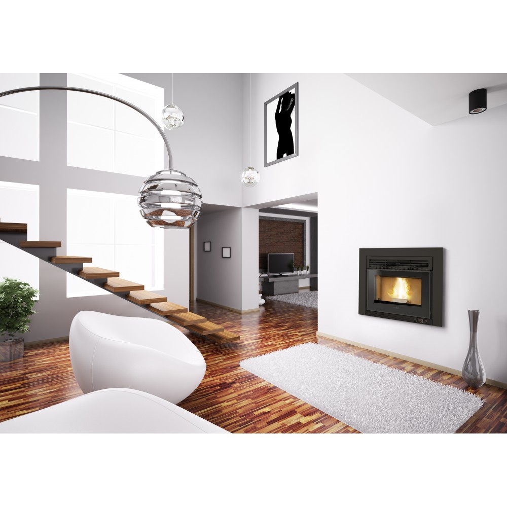 Estufa insertable con unas medidas reducidas que facilita la instalación. La puerta en cristal negro serigrafiado y la rejilla en aluminio satinado.