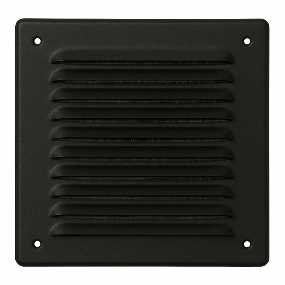 Rejilla de ventilación metálica en color negro, fabricada en chapa pintada y diseñada para ofrecer una ventilación eficiente en viviendas y locales. Su acabado epoxi aporta mayor resistencia y un aspecto moderno que combina con todo tipo de ambientes. Incorpora malla antimosquitos que evita la entrada de insectos sin reducir el caudal de aire.